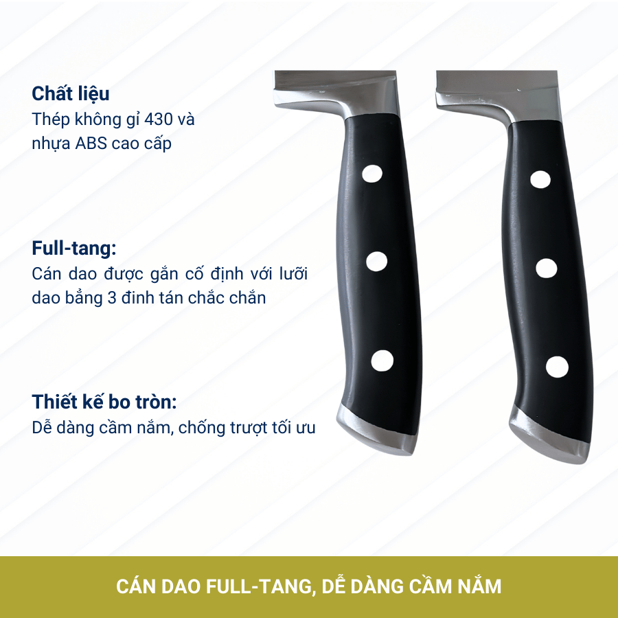 - Cán dao kết hợp thép không gỉ 430 & nhựa ABS cao cấp, được thiết kế bo tròn với khả năng chống trượt tối ưu, đảm bảo độ linh hoạt và thoải mái cho tay người sử dụng. Đồng thời, chất liệu nhựa cao cấp sẽ giúp bảo vệ chuôi khi tiếp xúc lâu ngày với nước và chất tẩy rửa.