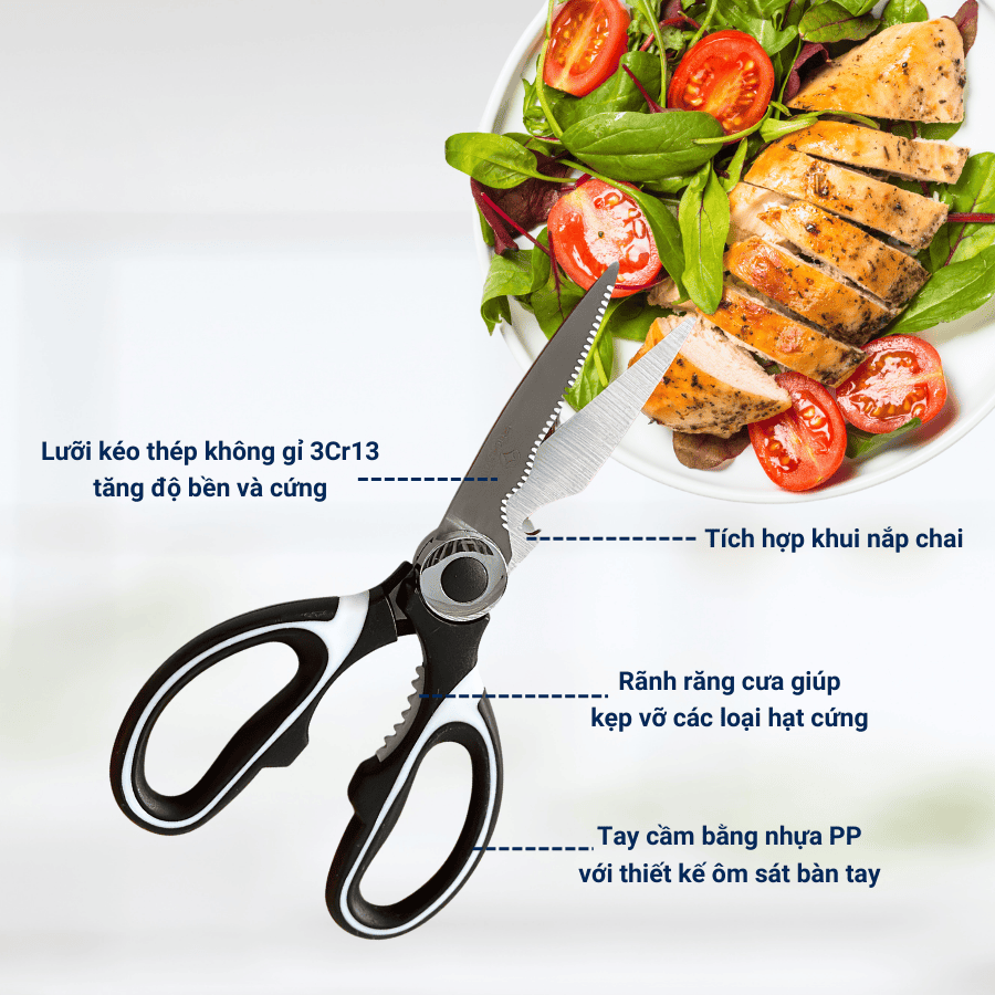 - Kéo được làm bằng Thép không gỉ chất lượng cao 3Cr13 giúp tăng cường độ cứng cho lưỡi kéo, và đảm bảo vệ sinh an toàn khi dùng để thực phẩm.